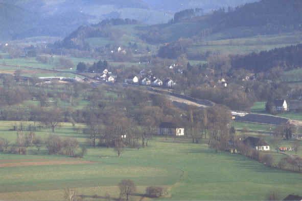 Blick nach SO: Golfplatz vorne. B31-Trasse mit Überführung (rechts) und Krummbach - Hagenbach. Oben links das neue "alte" Kirchzartner Rathaus in ziegelrot. Blick nach SO: Vorne das Wasserwerk an der Dreisam. Dann die neue B31-Trasse mit Falkhof rechts und Bruckmühle und Golfplatz-Überführung links. Hinten Neuhäuser. Blick nach S: Dreisam, Kieswerk am zukünftigen Kappler Knoten, dahinter der Hörchersberg und der Eingang zum Kappler Tal am 12.3.2005