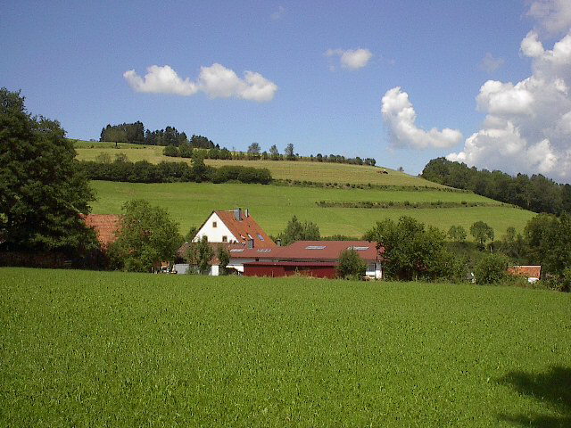 Blick vom Geroldstal nach Norden zu Bögelsbacherhof links und Gasthaus Löwen rechts Anfang August 2005
