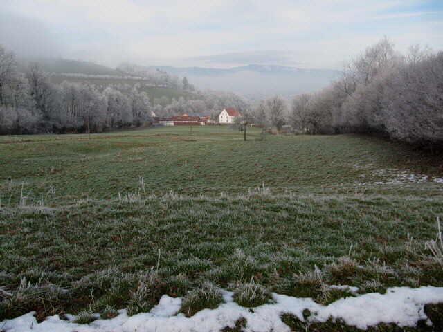 Blick nach Norden zum Tritschlershof am 20.1.2010 um 15 Uhr - Raureif und Nebel Blick nach Nordwesten zum Tritschlershof und Immi am 20.1.2010 um 15 Uhr - Raureif und Nebel