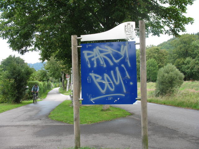 Seit Mitte August 2006 wird am Dreisamuferweg in Höhe des Ebneter Schloßstegs mehr und mehr geschmiert und geklebt sowie demoliert (Wasserweg-Schild beim Wasserwerk Ebnet zerstört). Schade.