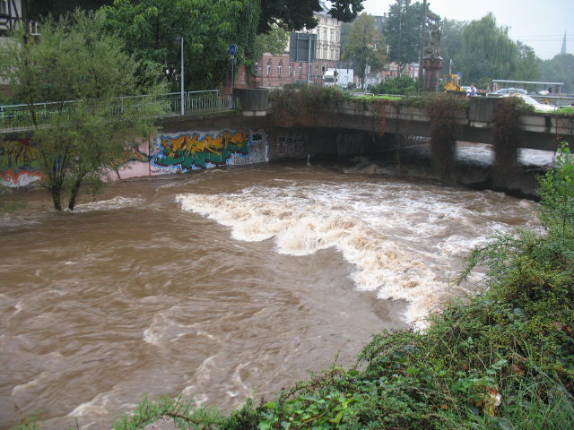 Blick nach Südwesten zur Schwabentorbrücke am 18.9.2006: Hochwasser über Fahrradweg und Graffiti