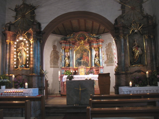 Blick vom Gasthaus Bären nach Norden zur Johanneskapelle am 31.8.2006 Blumenbeet mit Nachtkerze vor der Johanneskapelle am 31.8.2006 Restauratorin Regine Dengler erläuterte die bestandssichernden Arbeiten an den vermutlich vom Anfang des 16. Jahrhun-derts stammenden Wandmalereien.- mehr