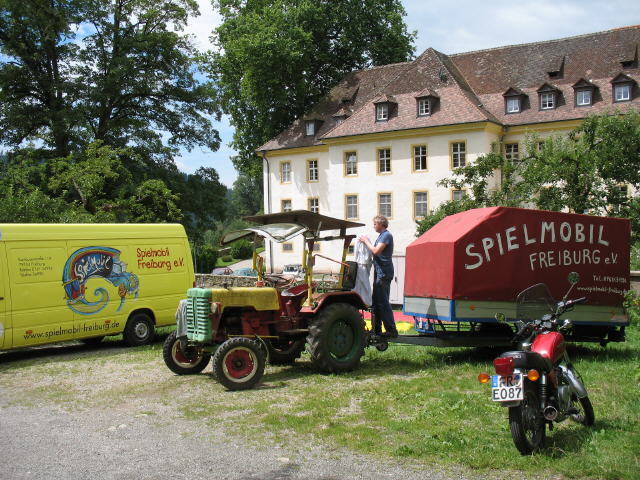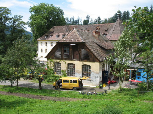 Blick nach Westen zur Werkstatt von Spielmobil-Freiburg an der Kartaus Spielmobil bei der Kartaus am 12.7.2007