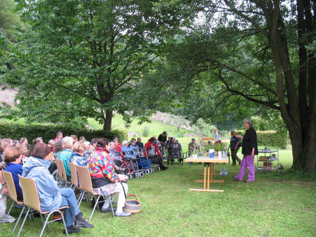 Am 12.7.2007 versammelten sich ungefähr 50 Besucher unter der großen Eiche hinter der Kartaus und warteten gespannt auf die Sozialdienst-Mitarbeiterin Ursula Bertsch, die als ausgebildete Heilkräuterfachfrau Heil-, Küchen- und Wildkräuter vorstellten wollte. Und die Erwartungen wurden erfüllt. Frau Bertsch stellte ihre Wildkräuter in der gemütlichen Halbrund unter dem mächtigen Baum vor, reichte wunderschön angerichtete Brötchen mit eßbaren Blüten und nahm die Besucher dann mit zu ihrem Kräutergarten zwischen Kartaus und Wald. Hier gab es viele Tips wie zum Beispiel: