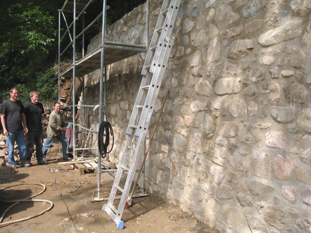 Die alte Kartaus ist umgeben von uralten Natursteinmauern, die teilweise zusammengefallen sind. Diese Mauern werden seit dem Jahr 2004 saniert - von drei Männern aus Nordhausen im Harz, die jeden Freitag und Montag die lange Strecke Freiburg-Nordhausen nach Hause fahren.