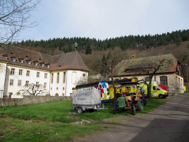 Blick nach Süden über den Garten hinter der Kartau zur Kirche am 2.4.2010 Am Kartausbach 24.7.2010: "Pinkeln hoch 3" Blick nach Norden zu Spielmobil und  Kartaus-Kirche am 2.4.2010