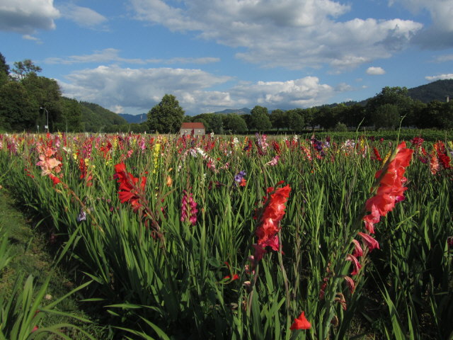 Kartaus am 27.7.2011: Blick nach Norden zu den Schafen - Solarstrom für den Zaun Blick nach Osten ins Dreisamtal bei der Kartaus am 27.7.2011 - Gladiolen