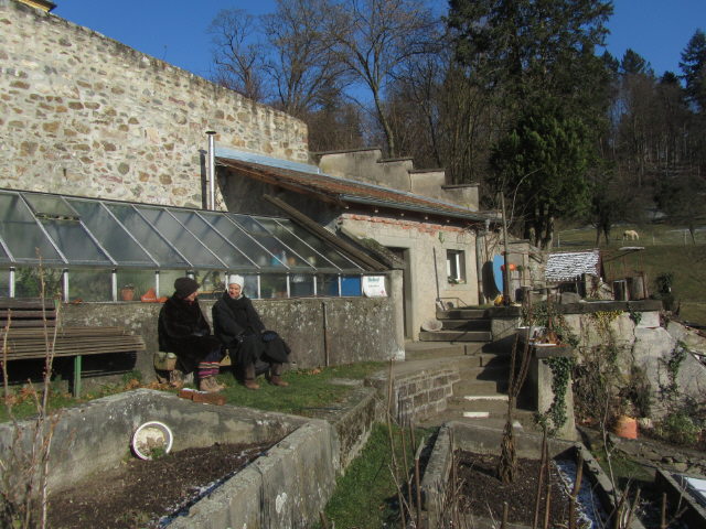 Seit Anfang Februar läßt ein sibirisches Hoch die Freiburger zittern und erstarren. Auch an der Kartaus steigen die Temperaturen nicht über -10 Grad. Aber: Der Nordostwind schafft es nicht in diese Ecke des Dreisamtals, der Ottilienwald schützt. Und im Klostergarten ist das Bänkchen beim Gewächshaus am Sonntag 5.2.2012 fast immer besetzt. Hier kann man vom nahen Frühling träumen?