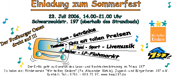 Jugend- und Bürgerforum e.V. (Haus197) und Spielmobil veranstalten in der Woche vom 19. - 23. Juni 2006 die große Spiel- und Spaßwoche Littenweiler. An jedem Tag in dieser Woche ist für Kids von 5 - 11 Jahren was los: