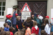 Klasse 2b mit Nora (8 Monate) bei der Dorfputzete am 19.5.2006 im Giersbergweg Auf dem Schulhof wird von den Schülern ein riesiger Müllberg präsentiert