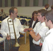 Erster Musik-Workshop im Dreisamtal mit 115 Jungmusikern Eschbach (hr.) Zum ersten Jugend-Musik-Workshop im Dreisamtal trafen sich am vergangenen Sonntag Jungmusiker der Musikvereine Buchenbach, Ebnet, Eschbach, Kirchzarten, Oberried, Stegen, St. Peter und Wittental. Der Bezirk Dreisamtal des Oberbadischen Blasmusikverbandes Breisgau e.V. (OBBV) hatte zu diesem Anlass in die Festhalle in Eschbach eingeladen. Ziel dieser Veranstaltung war es, Freundschaften zwischen den Vereinen zu pflegen und zu festigen und die Tradition der von 1967 – 2000 bestehenden Bezirkskonzerte zunächst im Jugendbereich wieder aufleben zu lassen. Georg Mayer, Bezirksvorsitzender und stellvertretender Präsident des OBBV, zeigte sich erfreut, dass dieser Workshop spontan von den Vereinen und Jugendlichen aufgenommen wurde und dankte den Verantwortlichen für die gute Organisation und Mitarbeit in der aufwändigen Vorbereitungsphase. Für die Jungmusiker der acht Dreisamtalgemeinden war es ein besonderes Erlebnis einmal in einem solch großen Orchester zu spielen, wofür sie gerne trotz herrlichem Herbstwetter einen Sonntag in den Proberäumen verbrachten, welche die Schule und der Kindergarten Eschbach freundlicherweise zur Verfügung gestellt hatten. Die musikalischen Leiter, Christoph Schönstein und Manfred Gimbel, waren überrascht und erfreut, mit welcher Disziplin die Jugendlichen mitgezogen haben. Auch die Jugendleiter der Vereine waren mit Spaß und Engagement bei der Sache. Carolin Freßle, Rainer Bär, Thomas Fräßle, Rudolf Heizler, Thomas Hoch, Marcellus Mayer, Michael Schönstein, Benedikt Schwörer, Klaus Wangler und André Wimmel leiteten die einzelnen Registerproben in denen die Musikstücke zuerst in kleinen Gruppen eingeübt wurden. Anschließend fand man sich zu einem großen Orchester aus insgesamt 115 Jugendlichen zusammen und die Gesamtorchesterprobe für das abschließende Konzert am Abend konnte beginnen. Zahlreiche Eltern, Verwandte und interessierte Blasmusikfreunde fanden sich zum Abschlusskonzert ein, welches guten Anklang fand und viel Lob erntete. Auch Dr. Harald Bobeth, Präsident des OBBV zeigte sich begeistert von dieser großartigen Idee und sprach aus, was alle Organisatoren, Konzertbesucher und auch die Jugendlichen dachten: Dieser Dreisamtäler-Jugend-Musik-Workshop sollte keine einmalige Sache gewesen sein, sondern sollte zur festen Einrichtung werden, idealerweise reihum veranstaltet von den beteiligten Vereinen. Die Jungmusiker, so war vielfach zu hören, freuen sich jedenfalls schon jetzt auf ein Wiedersehen. Gisela Heizler-Ries, Dreisamtäler vom 17.10.2002