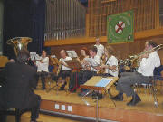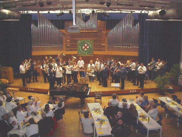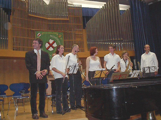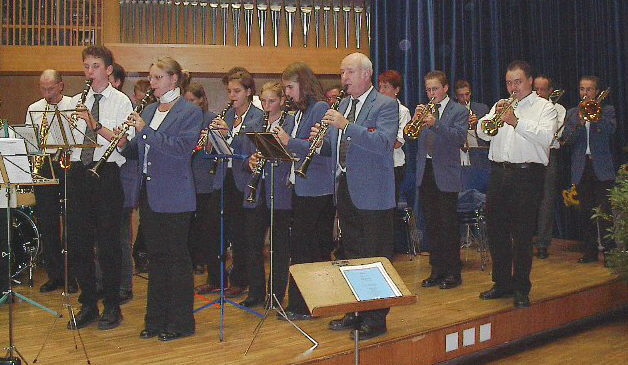 Neujahrskonzert 2004 vom Musikverein Buchenbach BUCHENBACH. Gerade noch reichte die Luft zum Atemholen, so dicht bevölkerte der Musikverein Buchenbach den Bühnenbereich der Sommerberghalle zu seinem Neujahrskonzert. Zehn Jungmusiker auf einen Schlag verstärkten die Reihen der Aktiven. Strengten sich enorm an, mit den auftritterprobten "alten Hasen" Takt zu halten.