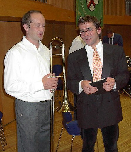 Exakt fünf Jahre, sieben Monate und drei Tage dauerte die fruchtbare Zusammenarbeit der Trachtenkapelle Oberried mit ihrem Dirigenten Hubert Mayer. Seine letzte Verpflichtung in Oberried, das Neujahrskonzert 2004, geriet zu einem überwältigenden Abschiedskonzert für den bewährten Musiker, der aus beruflichen Gründen den Taktstock in Oberried jetzt niederlegen muss. Allein schon das Programm signalisierte mit erfolgreichen Stücken der letzten fünf Konzerte unter der Überschrift "Gute Unterhaltung" einen überaus zufriedenen Rückblick. Ein "Glücksgriff" sei die Verpflichtung Mayers gewesen, der eine vertrauensvolle Zusammenarbeit folgte, locker und bewegt, unkompliziert und kreativ, ließ beredt Vorsitzender Willi Lauby zur Begrüßung die Konzertbesucher wissen. Dem Anlass entsprechend blätterte Amadeus Saier in seiner abendlichen Ansage zur besten Unterhaltung der Besucher humorvoll in der Vereins-Chronik. Einer gut gelungenen CD-Aufnahme der Aktiven nach durchfeierter Nacht verdankte das Konzert seinen Auftakt, den "Einzug der Gladiatoren". Komponist James Barnesi lieferte mit der eigens für Blasorchester geschriebenen "Alvamar Ouvertüre" das zweite Glanzlicht, bevor sich die Charakteristik der Strauß'schen "Fledermaus" in der dicht besetzten Goldberghalle entfaltete. Bevor Oberrieds Trachtenmusiker fantasievoll nach "Oregon" tendierten, ließ sich mit Andreas Saier ein sonorer Solo-Tubist hören - vom Publikum verdient gefeiert. Mit "The Floral Dance" erinnerte die Trachtenkapelle an ein so spannendes wie erfolgreiches Verbands-Wertungsspiel unter Hubert Mayer und blickte mit "Ross Roy" auf "zwei sehr unterschiedlich angenommene Stuhlkonzerte" zurück. "Moment for Morricone", "Let me entertain You" und "Udo Jürgens Live" lieferten schließlich den Beweis der Bandbreite der gemeinsamen künstlerischen Arbeit, "bei der uns Hubert Mayer mit viel guter Laune die Freude am Musizieren zu vermitteln versuchte", so Lauby. "Wir haben ihre Menschlichkeit sehr geschätzt und deswegen heute Abend auch für sie gespielt", voll des Dankes entließ Trachtenkapellenvorsitzender Willi Lauby mit diesen Worten Hubert Mayer aus seiner Verantwortung, der dennoch den Wunsch der Konzertbesucher nach Zugaben nicht abschlagen konnte. Ohne feuchte Augen kam keiner davon, standen doch die Musiker zum Schluss Schlange, Hubert Mayer zum Abschied mit herzlichen Worten und Gesten ihre Rosen zu überreichen. Als Hoffnungsträger des bewegenden Abends stand Christoph Schönstein, neuer Leiter des Jugendorchesters der Trachtenkapelle Oberried, mit der jungen Blasmusikgeneration im Scheinwerferlicht (über die an derer Stelle berichtet wird). In seinen Rundum-Dank schloss Willy Lauby alle ein, die dem Neujahrskonzert zu seinem Erfolg verhalfen, auch die musikalischen Aushilfen, die den "vollen Ton" des Orchesters garantierten und - da sie beide schon mehrfach eingesprungen waren, wurden Sepp Schwär und Thomas Fräßle (St. Peter) namentlich stellvertretend für alle genannt Monika Rombach , 8.1.2004