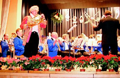 Als Gesamtleistung bestand das mittlerweile 21. Neujahrskonzert in einer großen Herausforderung für Dirigent Josef Schuler. Trug er doch die Verantwortung für den Trapezakt zwischen Spielbarkeit für neu Hinzugekommene, Anreiz für langjährig bewährte Aktive, und abwechslungsreicher Unterhaltung der Konzertbesucher, erstaunliche knappe 500 an der Zahl. "Hoffnung, Lachen und Musik als Begleiter des Jahres" zu überbringen, sei der Sinn dieses Konzertes, sagte Karl Willmann als Conférencier über die elf Kompositionen der Epochen von Johann Strauß Sohn über Jacques Offenbach bis John Lennon und Abba. Opulent begann das Orchester mit dem Festmarsch aus der Lortzing-Oper "Waffenschmied" und der Ouvertüre zu "Eine Nacht in Venedig". Dann war es an Bernhard Ketterer, Lampenfieber gegen klare Solotöne zu tauschen, die der in historischem Kostüm Auftretende mutig anging. Sinnige Geschichtchen und witzige Anekdötchen verwandte Karl Willmann geschickt zum Amüsement des Publikums - und zur Verschnaufpause der Musiker. Umso farbiger ließ sich daraufhin die Harmonik des Ferran-Pasadoble mit Castagnettenspiel angehen, den Potpourri "Besuch bei Offenbach" abstatten und in der Pause "dem Leib wohl tun, damit die Seele Lust hat, darin zu wohnen!" Zwei neue Instrumente, eine Bass-Klarinette, gesponsert durch die ortsansässige Firma Siko, und eine Oboe brachten neue Klangfarben ein, ein weiterer Grund für das Schwärmen vieler Zuhörer, es sei ein traumhaftes Konzert. Nach der mit Loskauf und Gewinnprüfen ausgefüllten Zeit marschierten "76 Trombones" auf, ließen das entsprechende Blech (Posaunen) und die Piccoloflöte Gerhard Schulers glänzen. Politik einmal anders: Unterschiedlichste Instrumente markierten die Bemühungen um ein flächendeckendes Europas zur Komposition "Euregio" von Kurt Göble. Von Begeisterung bis Zweifeln und dem (zweifelhaften) Bemühen, diese zu beseitigen. Zügig näherten sich Register, Solisten und Dirigent gemeinsam mit "Imagine" von John Lennon, Rag und Abba-Revival dem Konzertende. Als "tiefe Verbeugung vor unserem Publikum" widmete der Musikverein den letzten Titel "Espede" von Laserom, einen fulminanten Konzertmarsch den begeisterten Zuhörern. Drei gefeierte Zugaben folgten, bis die Musiker ihre Gäste den kreisenden Würfeln zum "Barsche" um einen gut behängten Christbaumdolden überließen Monika Rombach, 7.1.2004