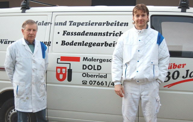 Oberried (glü.) Es ist immer wieder erfreulich, wenn alteingesessene und bewährte Handwerksbetriebe eigenen Nachwuchs haben, der auch Interesse am Geschäft der Eltern zeigt. Ein solcher Glücksfall ergab sich jetzt wieder in Oberried. Malermeister Peter Dold übertrug den nahezu 35 Jahre alten, im August 1973 von ihm gegründeten Malerbetrieb am 1. Januar 2008 an seinen Sohn Michael. Der 32 Jahre junge Malermeister freut sich, dass er die Familientradition fortsetzen und dabei auch weiterhin auf die tatkräftige Hilfe seines rüstigen Vaters bauen kann. Seit Betriebsgründung führt das Malergeschäft Dold sämtliche innen wie außen anfallenden Maler- und Tapezierarbeiten aus. Wärmedämmungen an Fassaden, das Verlegen sämtlicher Bodenbeläge und die Ausführung moderner Wandlasuren gehören zum weiteren Angebot. Dank eines eigenen Gerüstes sind Außenarbeiten an Gebäuden problemlos auszuführen. Peter Dold engagierte sich während seiner langen Selbständigkeit in vielen Ehrenämtern. So setzte er beispielsweise Zeit und Kraft im Vorstand der Malerinnung Freiburg, seit 50 Jahren im Musikverein Oberried und seit 21 Jahren als Gemeinderat ein. Vier Lehrlinge bildete Dold aus – einer davon war Jürgen Wissler, der seit 30 Jahren als Geselle beim Malergeschäft Dold arbeitet. Die Malerwerkstatt Dold, zunächst im eigenen Keller, dann in der Genossenschaftssäge in Oberried, befindet sich seit 2002 im Gewerbegebiet Brühl. Der Juniorchef Michael Dold lernte das Handwerk bei Erich Steinhart in Kirchzarten, machte Zivildienst in der Sozialstation Dreisamtal und arbeitet seit 1996 im väterlichen Betrieb. In den Jahren 2006/2007 besuchte er erfolgreich die Meisterschule in Lahr. Wie bereits Peter Dold’s Frau Gisela kümmert sich jetzt auch Nicole Dold, Michaels Frau und Mutter der zwei Kinder Lisa und Yannic, um die anfallenden Büroarbeiten. Als Steuerfachgehilfin wird ihr das keine allzu große Mühe machen.