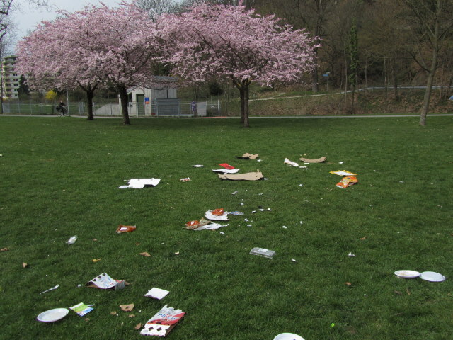 Müll an der Dreisam beim Ufercafe am 27.3.2011: Abfall hinter der Sitzbank "angeordnet und entsorgt" Müll an der Dreisam beim Sandfang am 27.3.2011: Blick nach Nordwesten am Sonntagnachmittag