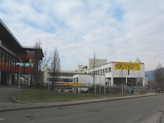 Blick nach Westen zur PH Freiburg am 28.1.2009 - Aufruf zum Boykott genehmigt? Schafe am 4.2.2010 in FR-Littenweiler bei der PH-Mensa