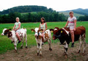 Fußgänger, Rad-, Motorrad- und Autofahrer reiben sich bei ihrem Anblick die Augen und halten bildlich fest, was sie kaum glauben können: Drei Mädchen auf den Rücken dreier Kälbern reiten über die Matte längs der Straße. Sarahs (9 Jahre), Marinas (8) und Sabrinas (10) ganze Aufmerksamkeit gilt dem vierbeinigen Rotbunten-Nachwuchs, es sind "Lusi" (sechs Monate), "Luzi" (sieben Monate) und "Sina" (fast 12 Monate), wollen die ungleichen sechs doch am nächsten Tag auf dem Reitplatz zeigen, was sie können. "Die Idee habe ich von meiner Cousine vom Gallihof in Unteribental", erzählt Sarah vom Reckenhof in Stegen. Das ist knapp ein Jahr her, damals suchte sie sich im elterlichen Viehstall gleich das kleine Rotbunten-Kalb "Sina" aus und führte es von nun an jeden Tag am Strick spazieren. Sina gewöhnte sich an den Hof, seine Menschen und Tiere, selbst an den Hofhund, an das selbst gebastelte Halfter und auch daran, dass sich Sarah auf sie draufschwang. Im Frühjahr galt es, den kleinen Bach zu überspringen und auf Zügeleinsatz zu laufen. Sarahs Eifer steckte ihre Freundinnen Marina und Sabrina an, bald durchliefen zwei weitere Kälbchen solch eine ungewöhnliche "Schulung". Zu dritt ging es "ins Gelände" auf den eigenen Koppeln. "Alle haben ihren Spaß daran", freuen sich die Mütter, Tanja Rombach und Diana Schuster, "Kinder und Tiere sehen sich täglich. Sie lernen die Landwirtschaft dadurch schätzen und interessieren sich für aktuelle Themen."