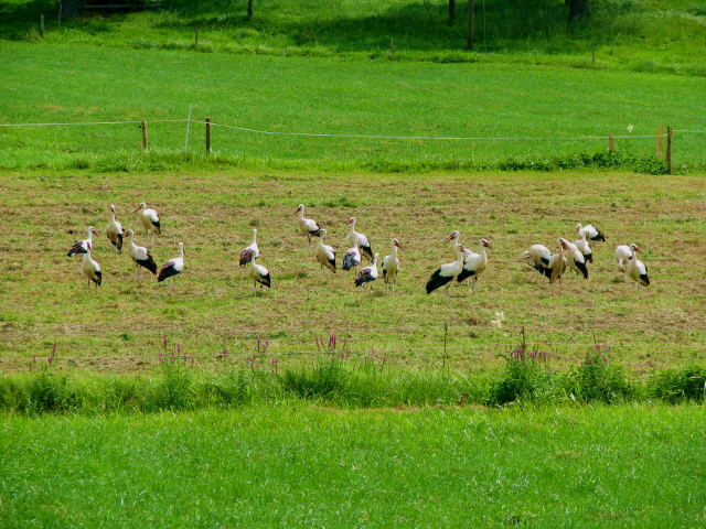 Storchenparadies Berlachen: Bis zu 30 Störche finden derzeit auf den grünen Matten schon ihre Nahrung. Darunter Ikarus, seine neue Frau und seine drei im Storchenhorst auf der Herz Jesu-Kirche Stegen geschlüpften Jungen. Gestern Abend 17.8.2009 mischten sich diese Drei mutig unter eine weidende Viehherde unseres Nachbarn Landwirt Peter Blattmann. Verstört über diese unvermutete Annäherung schnaubte eine wiederkäuende Mutterkuh zunächst, dann noch einmal sehr aufgeregt, schließlich sprang sie auf, um die gefiederten "Ein",/"Auf?"-Dringlinge von ihrem Nachwuchs zu verscheuchen. Erscheinungen des Klimawandels? Afrika lässt grüßen - Vögel "reiten" künftig auf Kühen?
