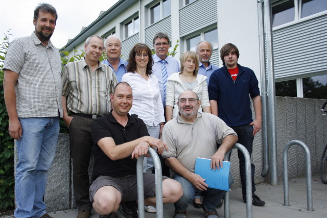 Neuer und alter Vorstand: Hintere Reihe von links nach rechts. Martin Stücker (2. Vorsitzender), Klaus Meister (Kassierer), Siegfried Thiel (Abgeordneter des Gemeinderats), Anke Fenning (1. Vorsitzende), Dieter Rinke (Ex-Vorstand), Juliane Kürner (Beirat), Klaus Kiesel (Ex-Vorstand), Thomas Maier (Beirat) Vorne: Stefan Pohl (Jugendreferent), Eugen Winter (Ex-Vorstand)