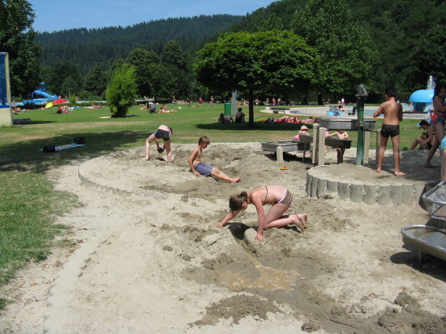 Fleißige Eltern: Die beiden alten Wasserpumpen funktionieren ohne Strom - trotz Handbetrieb und Muskelkraft laufen sie bei schönem Wetter ohne Ende, von 9 Uhr von 20 Uhr, betätigt von Mama oder Papa. Resultat: Viel Matsch, kühne Sandburgen, Seen und Bäche. Und vor allem viel Spaß für die Kleinen und fast genauso schön wie am Meer.