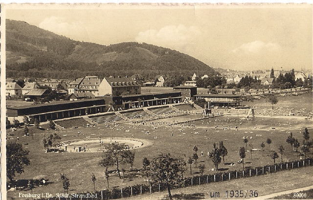 Bau 1932-1935: Die großen Erdbewegungen wurden vom "Freiwilligen Arbeitsdienst" mit Hacke und Picke übernommen. Dann übernahmen Freiburger Handwerksbetriebe. Arbeiten in zwei Schichten. Ab 20.3.1934 wurden auf Weisung des OBs 100 Notstandsarbeiter hinzugezogen. Im Winter 1934/35 wurden Arbeiter im Rahmen des "Wohlfahrtsprogramms - Arbeitsbeschaffung" beschäftigt - dabei bezahlte das Wohlfahrtsamt die Löhne und Sozialbeiträge. Sachausgaben wurden über Sonderkredite finanziert. Baukosten zum 9.3.1935: 410.000 Reichsmark. Kapazität der Einzel- und Sammelumkleiden lag bei 7200 Personen - Umkleiden auf der Wiese war untersagt!