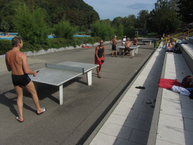 (1) Strandbad-Tischtennis am 10.9.2011: Morgens um 11 Uhr beim Training Strandbad-Tischtennis am 10.9.2011: Training - Blick nach Osten Strandbad-Tischtennis am 10.9.2011: Adolf Seger "spielt sich ein"
