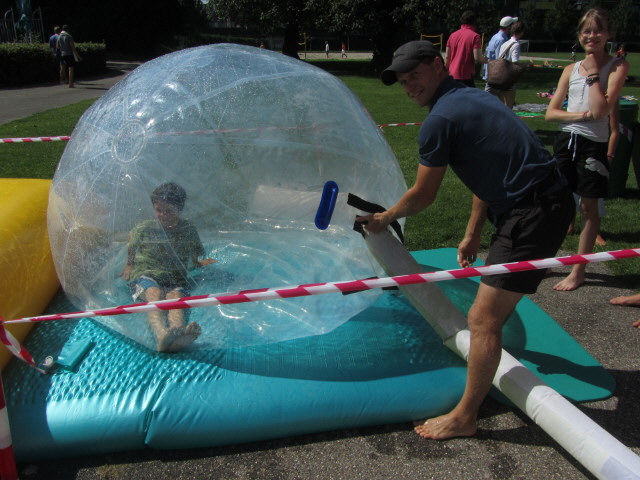 Waterball im Strandbad am 13.8.2011: Durch den Reißverschluss reinkrabbeln, dann Luft nachpumpen Waterball im Strandbad am 13.8.2011: 10.9.2011