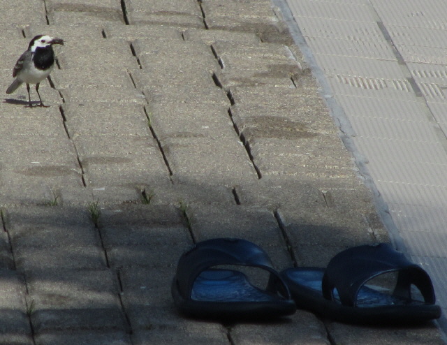 Strandbad am 5.6.2011: Bachstelze mit Badeschlappen Strandbad am 5.6.2011: Bachstelze mit Badenixe Strandbad am 5.6.2011: Bachstelze vor dem Eingang (Loch links) zum Nest