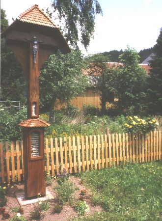 18. Das Missionskreuz auf der Nordseite der St. Gallus Kirche. Im Friedhofsbereich hinter der St. Galluskirche steht am Hauptweg ein nahezu 5m hohes Kreuz aus rötlichem Buntsandstein. Es wurde nach Ausweis der Inschrift am 11. Oktober 185o von Joseph Spiegelhalter und Theres Zängl (Zängerle?) von Geroldstal gestiftet. In den massiven Sockel wurde aus dem Paulusbrief an die Galater (6,14) eingeschrieben: