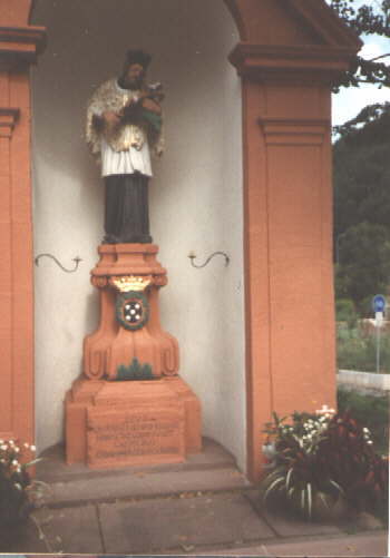 16. Die Nepomuk-Darstellung in Ebnet Jeder kennt sie aus dem Stau auf der Dreisambrücke bei Ebnet: Die Darstellung des Hl. Johannes Nepomuk, des Wasserheiligen, Patrons aller am Wasser oder mit dem Wasser arbeitenden Menschen, schließlich begegnet dieser „Brückenheilige" dem Beobachter überall in Deutschland, in Polen und den alten Habsburger Ländern, sogar in Paraguay. Wer war dieser Johannes „von Pomuk" und warum steht er immer auf Brücken oder in der Nähe eines Flußlaufes? Warum heißt es so oft: „O Heiliger Sankt Nepomuk - beschütz uns und die Bruck" ? Dieser „Johannes ne Pomuk" stammt aus einem tschechischen Dorf, studierte 1350 an der eben gegründeten Karlsuniversität in Prag und promovierte später in Padua im Fach „Theologie", wurde Generalvikar in Prag. Als solcher hatte er die Belange der Kirche gegen den deutschen König Wentzel IV. zu vertreten, dessen Vater Karl damals Prag zu seiner wunderschönen Hauptstadt gemacht hatte. Böhmen gehörte in dieser Zeit zum Deutschen Reich. Es kam –wie überall seit dem Mittelalter- zu Streitigkeiten zwischen Kirche und Staat. Die Deutschen hatten die Führungspositionen in Böhmen inne, die Tschechen litten darunter. Diese politischen Probleme mußte der Vertreter des Bischofs, Johannes von Pomuk, mit dem König austragen. Als Tscheche bezog er eine klare Stellung gegen den deutschen König. Das Dumme allerdings war, daß er gleichzeitig Beichtvater der Königin Johanna war. Jetzt vermischen sich -wie so oft- Historie und Legende: Der überaus eifersüchtige und streitsüchtige König Wenzel IV. verlangte vom Generalvikar Johannes Nepomuk, daß er das Beichtgeheimnis verletze und über Wenzels Frau Aussagen mache. Als der sich weigerte, ließ er den unbequemen Gegenspieler am 2o. März 1393 kurzerhand von der Prager Brücke in die Moldau werfen, eine andere Form der Prager Fensterstürze zur Lösung politischer Fragen. Dort wurde sein Leichnam gefunden, umgeben von 6 glitzernden Sternen, die das Wort „TACUIT=er hat geschwiegen" symbolisieren sollen. Aber erst im Jahre 1693 -rund 3oo Jahre nach dem Geschehen- setzte man ihm auf der Prager Karlsbrücke ein Bronzedenkmal, -es wurde der Prototyp für alle weiteren Darstellungen. Daß der Brückenheilige eine solch weite Verbreitung in allen Habsburger Ländern fand, hat (auch) einen politischen Hintergrund. Einen anderen Tschechen, Johannes Hus, Rektor der Prager Universität, hatte der deutsche Kaiser Sigismund 1415 in Konstanz wegen seiner Kritik an der Kirche- trotz der Zusage freien Geleits- auf dem Scheiterhaufen verbrennen lassen. Daraus hatten sich in Böhmen die langdauernden „Hussitenkriege" entwickelt. Um das Andenken an Johannes Hus aber zu verdrängen, setzten im Zeitalter der Gegenreformation vor allem die Jesuiten „einen anderen Johannes", eben den von Pomuk, an die Stelle und verbreiteten seinen Kult. Im Jahre 1729 wurde er dann sogar heilig gesprochen. Wegen seiner Ermordung durch Ertränken im Wasser ist er seitdem der Patron der Flößer und Gerber, der Schiffer und Müller, vor allem auch der Priester, weil er das Beichtgeheimnis wahrte. Deswegen hält er auf Abbildungen auch manchmal den Zeigefinger vor den Mund als Geste des Schweigens. Der Palmzweig in der Hand weist ihn als Martyrer aus. Im Prager Veitsdom ist er später beigesetzt worden. Bei der Öffnung des Grabes sei seine Zunge unverwest vorgefunden worden. Ein Mitglied der Familie derer „von Sickingen", Mainzer Domkapitular und späterer Bischof von Konstanz (um 175o), Kasimir Anton, läßt eine neue Nepomukstatue an der Dreisam errichten, ehemals stand es auf der anderen Straßenseite, nachdem die schmale Holzbrücke wieder einmal vom Hochwasser weggerissen worden war. Zum Schutze errichtet man auch das Kapellenhäuschen, das wir heute noch haben. Eine Legende von einem Bäuerlein mit einem Fuhrwerk entwickelt sich auch um diese Brücke: es will von Nepomuk gerettet worden sein, als die Brücke hinter ihm vom Wasser weggerissen wurde. Johannes von Pomuk trägt auf der Ebneter Darstellung die für einen katholischen höheren Geistlichen typische Tracht: auf dem Kopf das Birett, die Stola und die mit Hermelin besetzte Mozetta um die Schultern, darunter das weiße Chorhemd (Rochett) und den schwarzen Talar. In der linken Hand hält er das Kruzifix, mit der rechten die Palme des Märtyrers. Unter der Statue auf dem geschwungenen Sockel erkennt man das Wappen der Herren von Sickingen, 5 silberne Kugeln auf schwarzem Grund. Die Familie v. Sickingen war seit den Bauernkriegen im 15. Jh. eine angesehene und erfolgreiche Adelsfamilie. 1567 hatte der protestantische Franz Conrad v. Sickingen die reiche katholische Anna von Snewlin-Landeck geheiratet und durch kluge Heiratspolitik deren reiche Besitzungen in und um Freiburg und im Breisgau erworben. Die jungen Eheleute wohnten wahrscheinlich zunächst in einer Ebneter Wasserburg (Weiherschloß), erst 175o ist das heutige Ebneter Schloß fertiggestellt worden.. In Freiburg besaßen die „Reichsfreiherrn" seit 1769 ihre Stadtwohnung, das „Sickingen-Palais" auf der Salzstraße, das heutige Landgericht. Im Basement der Nepomukstatue findet man deswegen einen lateinischen Spruch, daß Casimir, aus dem Geschlecht der Barone von Sickingen dem seligen (divo!) Johannes von Pomuk diese Statue aufgestellt hat. Aus den Großbuchstaben, einem Chronogramm, ergibt sich in aus der Addition der Großbuchstaben die Jahreszahl 1725 für die Aufstellung der Statue. Interessant in diesem Zusammenhang ist übrigens, daß dieser Casimir Anton von Sickingen als Bischof von Konstanz seinen Leib in Konstanz in seiner Bischofskirche beerdigen ließ, daß er aber sein Herz in einer Kapsel in der Hilariuskirche von Ebnet, seiner Heimat, bestatten ließ. Übrigens haben später in dieser Hilarius-Kirche von Ebnet die Schwiegereltern Mozarts, Fridolin und Maria Weber, anno 1756 geheiratet, wie das Freiburger Münsterregister nachweist. Eine Reihe von Nepomuk-Darstellunge