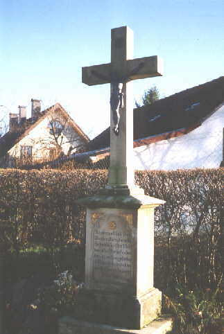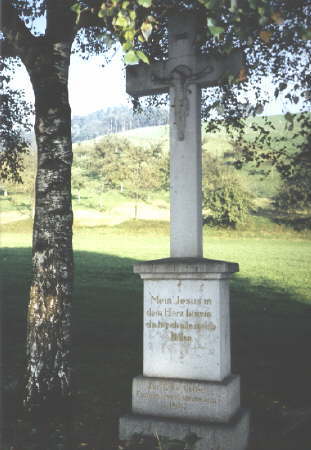 Verhältnismäßig jung (1966) ist das hölzerne Hauskreuz unter dem Schindelwalmdächle von Alfons und Erika Winterhalter (Weilersbach 29). Es wurde gestiftet, wie die Initialen am Schaft ausweisen, von Alfons und Rosa Schweizer, die im Zastlertal daheim gewesen waren. Eines ihrer Kinder war verunglückt, der Vater war ohne Arm aus Rußland zurückgekommen, sie selbst, die von vieler körperlicher Arbeit sterbenskrank war, hinterließ 8 Kinder, wovon das jüngste gerade anderthalb Jahr alt war. So mußte die älteste Tochter Erika mit gerade 15 Jahren die Geschwister erziehen und für die große Familie sorgen, eine Aufgabe, die nicht jedes so junge Mädchen hätte bewältigen können. Zum Andenken an die Verstorbene errichtete man das Holzkreuz. Unterhalb des Freslehofes stößt man auf dem Weg zum Hinterwaldkopf noch vor der Hofkapelle auf ein schönes Holzkreuz von 1958 mit den Stifterinitialen F.F- M.H. Darüber sind das A und O (Alpha und Omega) als symbolischer Hinweis auf Anfang und Ende angebracht und man liest auch das kleine christliche Stoßgebet: Gekreuzigter Herr Jesus Christus, Hilf uns beten. Am „Brissenhof" schaut der Wanderer auf ein schlichtes Steinkreuz, das statt des Korpus die symbolträchtigen Abkürzungen IHS (Jesus Heiland Seligmacher) enthält. Auf einer eingelegten Sockelplatte findet man: ICH BIN DER/ WEG DIE/ WAHRHEIT/ UND DAS LEBEN./ GESTIFTET VON DER FAMILIE LAUBY 1952. Gegenüber dem Schweizerhof von Familie Heizmann erinnert ein sehr schönes braun gehaltenes Holzkreuz an den Tod von: Max Heizmann/ gefallen / in Rußland/ 1942. Ein verzierendes Kupferdach überwölbt die weitausladende weiße Rückwand und den Kruzifixus, der eine eigenartige Ausstrahlung besitzt. Dem in fremder Erde Ruhenden wurde hier von den trauernden Eltern wenigstens ein Erinnerungskreuz gesetzt. Beim Oberbauernhof, dem letzten Hof vor der Schranke hinauf zum Sonneck, steht im Garten der Familie Bernhard Maier ein immer noch schönes Steinkreuz, das auf dem Sockel eine bäuerliche Sichel und Weizengarben enthält. Die Hände des leidenden Heilandes sind hier zu Fäusten verkrampft, insgesamt wirkt der steinerne Korpus ein wenig klein für dieses Kreuz, dessen Abdeckplatte über dem Sockel mit Voluten abgerundet ist. Es wurde: gestiftet von Anselm Mayer und/ Josefa geb.Maier im Jubel/jahr des hl. Kreuzes/ 1933.Die Inschrift auf dem Sockel trägt einen modernen Spruch: Wechselnde Pfade/ Schatten und Licht/ Alles ist Gnade/ Fürchte dich nicht. Im „Jubeljahr" 1933 ? – Das hat etwas mit christlicher Tradition zu tun. Jubeljahre wurden seit 13oo gefeiert, als anstelle der Wallfahrt nach Jerusalem die nach Rom trat und später das vermauerte Jubeltor des Petersdomes am Hl.Abend durch den jeweiligen Papst geöffnet wurde. Seit 1475 beging man ein Jubeljahr alle 25 Jahre, 1933 allerdings feierte man das außerordentliche Jubeljahr als Erinnerung an den Tod Christi im Jahre 33 christlicher Zeitrechnung. Auf dem Erlenacker der Familie Sutter auf dem Hügel über dem Weilersbachtal sieht man als eine Art „Gipfelkreuz" ein schlichtes Eichenholzkreuz ohne Korpus mit den Initialen M.G. Erst am Karfreitag 1991 wurde es dort oben von Manfred und Maria Gitschier (geb. Freßle) und Margarethe Giovanni errichtet und am Karsamstag vom damaligen Oberrieder Pfarrer Horn eingeweiht. Es soll der Ehre Gottes dienen und die Blicke der Wanderer „nach oben" ziehen. Hermann Althaus, Der Dreisamtäler, 8.11.2001