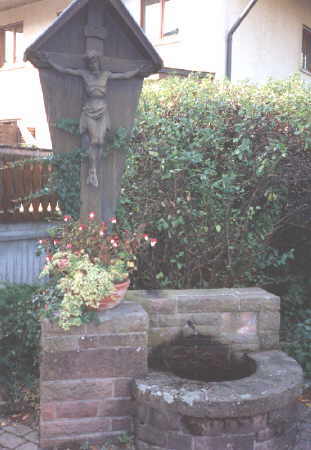Brunnenkreuze – Kreuzbrunnen trifft man vielfach im christlichen Land. Das für Mensch und Tier notwendige Quellwasser ist das Symbol für Christus als Leben spendende Nahrung für die Gesundheit der Seele. Das Wasser ist ja seit jeher ein Sinnbild des Lebens, und christlich betrachtet verströmt der Kruzifixus über den Tod hinaus seine Gnade in Fülle für alle, die durstig sind nach der Gerechtigkeit und dem ewigen Leben. Der Kirchzartener Kreuzbrunnen (der Familie Willi Zähringer) gegenüber einer Tankstelle am Ortsausgang Richtung Kappel stammt aus dem Jahr 195o. Schon früher war hier ein Brunnentrog, der dem Vieh zur Tränke diente, aber auch manchem Wanderer aus Freiburg einen erfrischenden Trunk bot. Da hatten der Postschaffner a.D. Karl Hug und sein Sohn Max nach Abriß des alten Bauernhauses die Idee, zusammen mit dem Neubau eine sinnvolle Ausgestaltung der Brunnenanlage vorzunehmen und dieses Kreuz zu errichten. Man weiß, daß Max Hug damals im neu aufgekommenen „Totospiel" einen Hauptgewinn erzielte, denn er stiftete im gleichen Jahr auch „zum Dank für die glückliche Heimkehr aus Krieg und Gefangenschaft" eine neue 24 Zentner schwere „St.Gallus-Glocke" im Kirchturm, nachdem andere Kirchzartener Glocken als sog. „Glockenopfer" im 2.Weltkrieg eingezogen worden waren.-