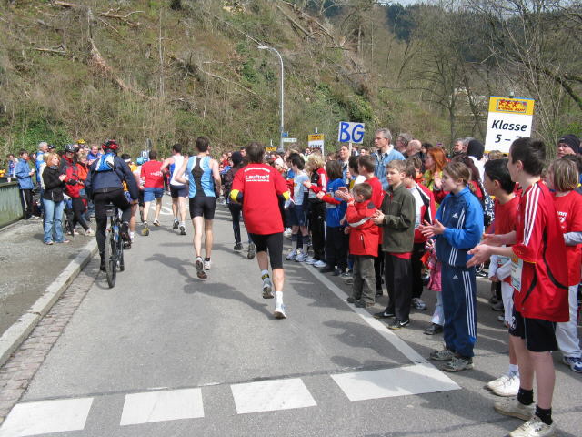 Blick nach Westen auf dem Dreisamuferweg am 6.4.2008 - Freiburg-Marathon um 12.30  Uhr Schüler-Staffellauf S'Cool run am 6.4.2008 beim Sandfang: Medaillen und Bananen chüler vom Haus Tobias am 6.4.2008 beim Sandfang um 12.45 Uhr