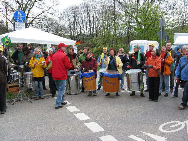 Blick nach Osten über die Dreisam am Sandfang am 6.4.2008 um 12 Uhr Schüler auf der Sandfangbrücke am 6.4.2008 Samba mit der Trommelgruppe Sambasta.de am Sandfang 6.4.2008
