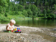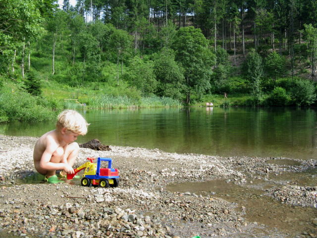 Nach einer kräftigen Stärkung rüsten wir uns für den Weitermarsch. Vom See aus halten wir uns nun links, orientieren uns an der blauen Markierung Richtung Neuenweg/Vorderheubronn. Erfreulicherweise geht es wieder auf einem netten, breiten Waldweg durch das Naturschutzgebiet eine ganze Weile bergab, an Verzweigungen halten wir uns stets links. Holpernd rollen die Räder den Berg hinunter, über Stock und Stein. Anders als auf der ersten Wegstrecke befinden wir uns nun auf einem gut frequentierten Wanderpfad. Wir entdecken Heidelbeersträucher und Pferde, begegnen Sportlern beim Nordic Walking und Spaziergängern zuhauf. In Vorderheubronn angelangt sehen wir bereits den Parkplatz, unseren Ausgangspunkt, der oberhalb an der Landstraße liegt. Über einen Wiesenweg ("Blaue Raute"/"Rundweg 2 und 3") erreichen wir nach einem etwa 30 Meter langen und steilen Anstieg erschöpft das Auto. Das wäre geschafft, mitsamt Kinderwagen.