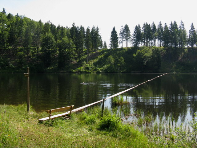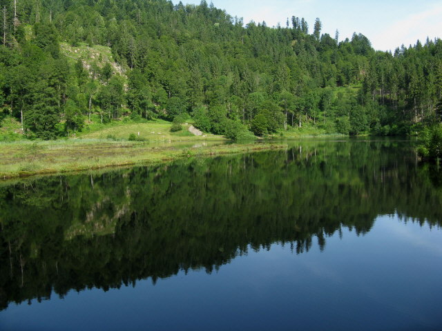 Wer kann, sollte nicht gerade an Wochenenden hierher kommen, denn da ist nach Auskunft der Betreiber der ansprechenden Gaststätte "Fischerhütte" kurz vor dem Weiher "so richtig was los". Der Nonnenmattweiher gehört zur Gemeinde Neuenweg und steht, so informieren mehrere Hinweistafeln, seit dem 31. Juli 1987 unter Naturschutz, ebenso wie die 70 Hektar, die ihn umgeben. Der Weiher befindet sich in einem Gletscherkar, von der letzten Eiszeit übrig geblieben, geprägt von hohen Felswänden drum herum und vorgelagerten Moränenwällen. Was ihn aber einzigartig macht, ist eine Torfinsel mitten im See, ein Biotop mit seltener Vegetation, eine "extrem trittempfindliche Lebenszone", deren Betreten denn auch strengstens untersagt ist, ebenso wie das Verlassen der markierten Wege durch das gesamte Naturschutzgebiet. Baden ist aber erlaubt: in der abgetrennten Badebucht mit ihrem leicht moorigen Wasser und vielen Fischen, die sich durch die Badegäste nicht stören lassen.