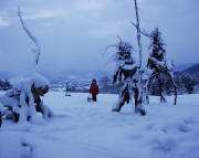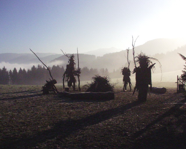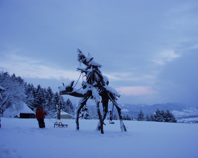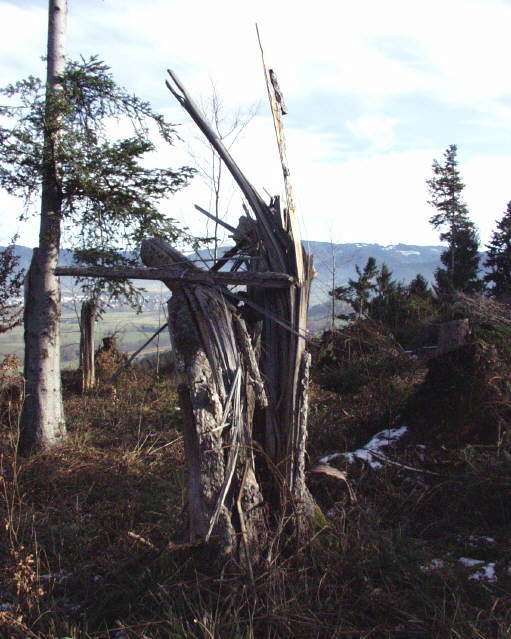 Die erste Krippe am Pfeiferberg entstand im Jahr 2002. Orkan Lothar lieferte Holz zuhauf. Die Höhe 527 - heute Kamelberg genannt - war abrasiert. Aus diesem Sturmholz entstanden all die Skulpturen und Hütten - das Jesuskind war das einzige Stück frisches Holz.