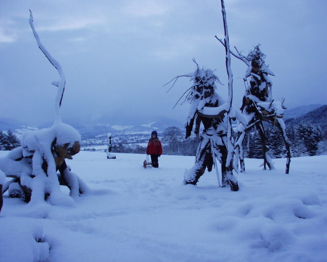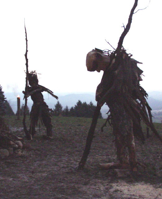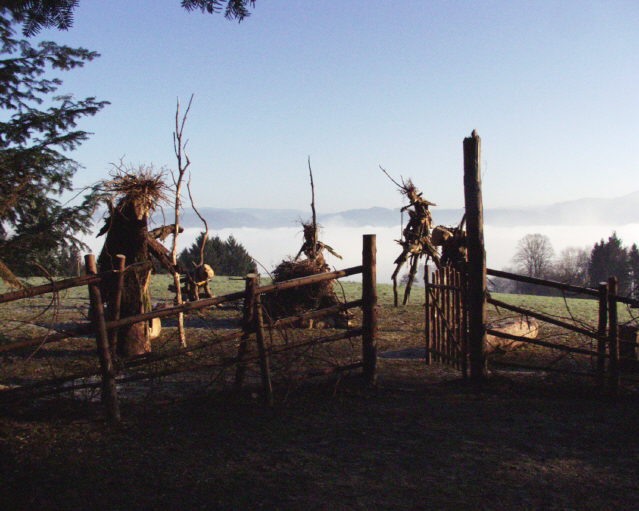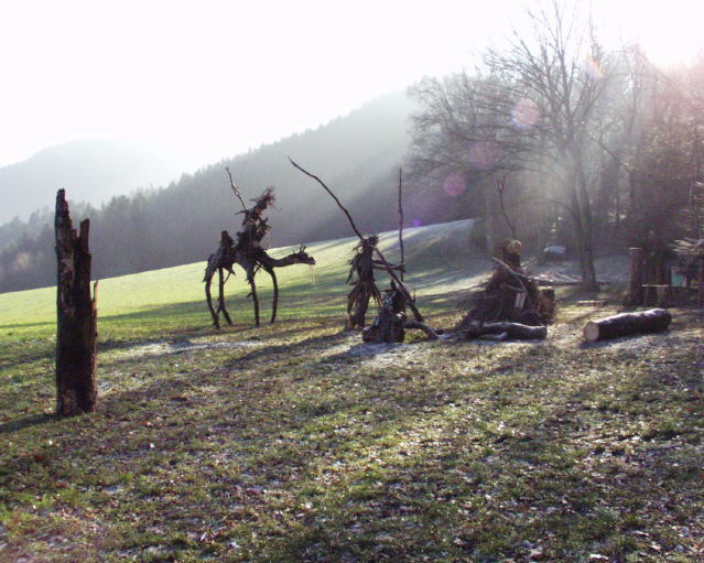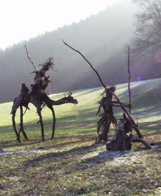 An seiner Seite der heute 70-jährige Faller – und dessen Traktor. Pünktlich zu Weihnachten 2002 strömen die ersten Wanderer zur aufgestellten Krippe, die das Motto „Vergänglichkeit" trägt und alle Erwartungen übertrifft. Die Figuren sehen aus, als seien sie der Requisitenabteilung eines mystischen Fantasy- Filmes entsprungen. Stämme und Äste mischen sich zum Teil unverarbeitet mit fein herausgeschnitzten Gesichtskonturen, einige Figuren haben Kleider, andere einen Busch als Haarpracht. „Das Thema Vergänglichkeit haben wir damals gewählt, weil die Krippe eben aus Naturmaterialien gemacht worden ist. Die Natur hat uns das Holz gegeben, sie hat es selbst erschaffen und wieder abgerissen. Wir lassen hier morsches Holz wieder auferstehen und geben es der Natur zurück", sagt Rees, ein bescheidener, tiefgründiger Mann. Genauso wie er den Titel „Vergänglichkeit" bewusst gewählt hat, benutzt er auch das Wort „zurückgeben" bewusst: Nach ein paar Monaten kehrt das Holz an seinen ursprünglichen Ort zurück. Er verfrachtet die Krippe mitsamt den Skulpturen und dem gebauten Kamel auf die Bergkuppe, auf der er das Holz gefunden, gesehen hat.