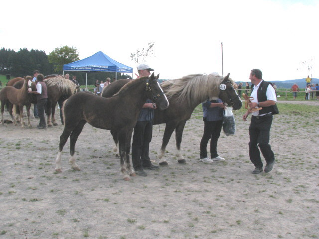Als höchst bewertete Stute des Tages ging die dreijährige "Primadonna" aus der Beurteilung hervor; eine Tochter von Prämienhengst Feldsee und Maya aus dem Elitehengst Moritz. 1,57 Meter groß und ausgestattet mit dem Gangvermögen des Vaters, fleißigem Schritt und räumendem Trab. Sehr zur Freude ihres Züchters Arnold Schütz aus Obereschach (Villingen-Schwenningen). Ihr folgten "Amelie" und "Alina", Töchter des Elitehengstes Riegel aus der Anette von Moritz, gezüchtet von Hengsthalter Werner Blattert, Bonndorf-Dillendorf. Erstaunte Blicke ruhten auf den 1,57 und 1,55 Meter großen Stuten, die dem sehr selten gewordenen Schlag der "Braunen Schwarzwälder" angehören. Ihr Fell glänzt fuchsbraun, Mähne und Schweif sind schwarz bis schwarzmeliert. Werner Blattert bemüht sich seit vielen Jahren erfolgreich um den Erhalt dieser Schwarzwälder Füchse.