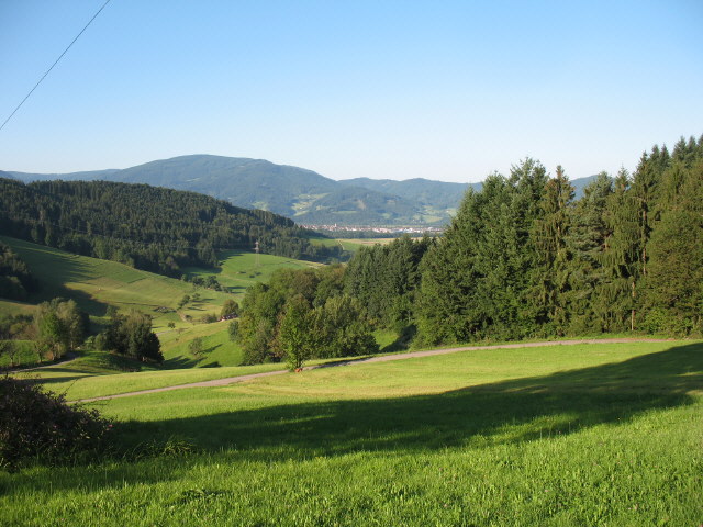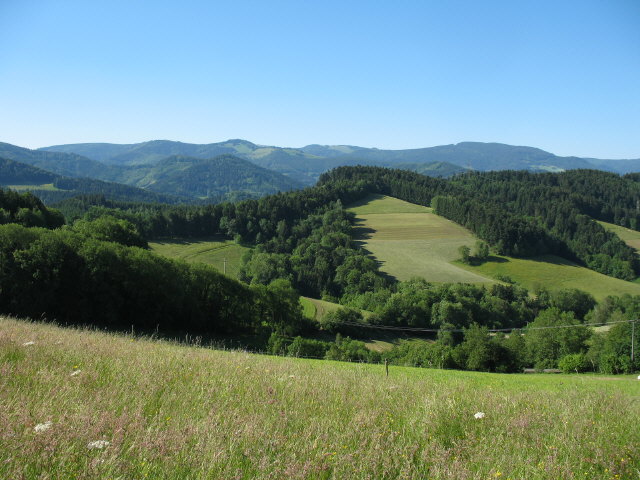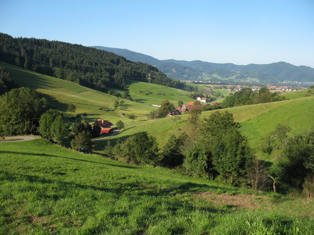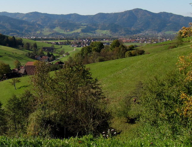 Blick vom Thomasberghof nach Südwesten - hinten rechts die Häuser des Dreisamtals