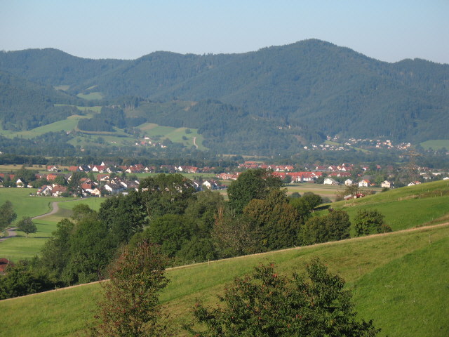 Tele-Blick nach Südwesten über Stegen-Oberbirken nach Neuhäuser (Mitte) und Kappel (rechts) und hoch zum Kybfelsen am 26.8.2007 Blick nach Norden über den Rechtenbach zum Rössle am 26.8.2007