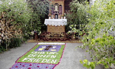 Seit rund zehn Jahren gibt es in Saig die “Fronleichnams-Frauen” die die Altäre im Ort und den Weg zur Kirche mit Blumenteppichen schmücken. Die Entwürfe, sehr beeindruckend, stammen von Christoph Bruckert, einem Saiger, der in Freiburg als Bühnenmaler arbeitet. Der Frühsommer war besonders gnädig und so gab es leuchtendes Rot von Pfingstrosen, lila Flieder und junge Tannentriebe, die ein fast flammendes Hellgrün lieferten. Von 4.30 Uhr an waren die Frauen zugange, um 8 Uhr war das Werk getan. Sehr erfreulich ist der Kruzifix-Alter im Eingang zum Pfarrhaus. Erinnerungen werden wach bei denen, die in Saig der Prozession beigewohnt haben, wenn sie den Altar in der Scheuneneinfahrt zum Diemand-Wanglerhof sehen. Das Schnitzwerk stammt von einem Schreiner, der einst dort eine Werkstatt betrieben hat und beeindruckt mit Tafelwerk und dem silbernen Kreuz im Tabernakel. Am Hochfirst darf der Perserteppich trotz Blumenteppichs nicht fehlen. Dieser aber trägt diesmal eine feine Inschrift, kaum lesbar zwischen den Blüten. “Christi Liebe ist stärker”