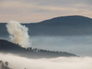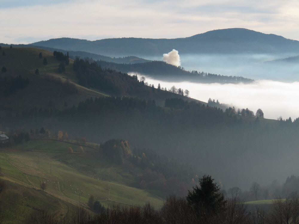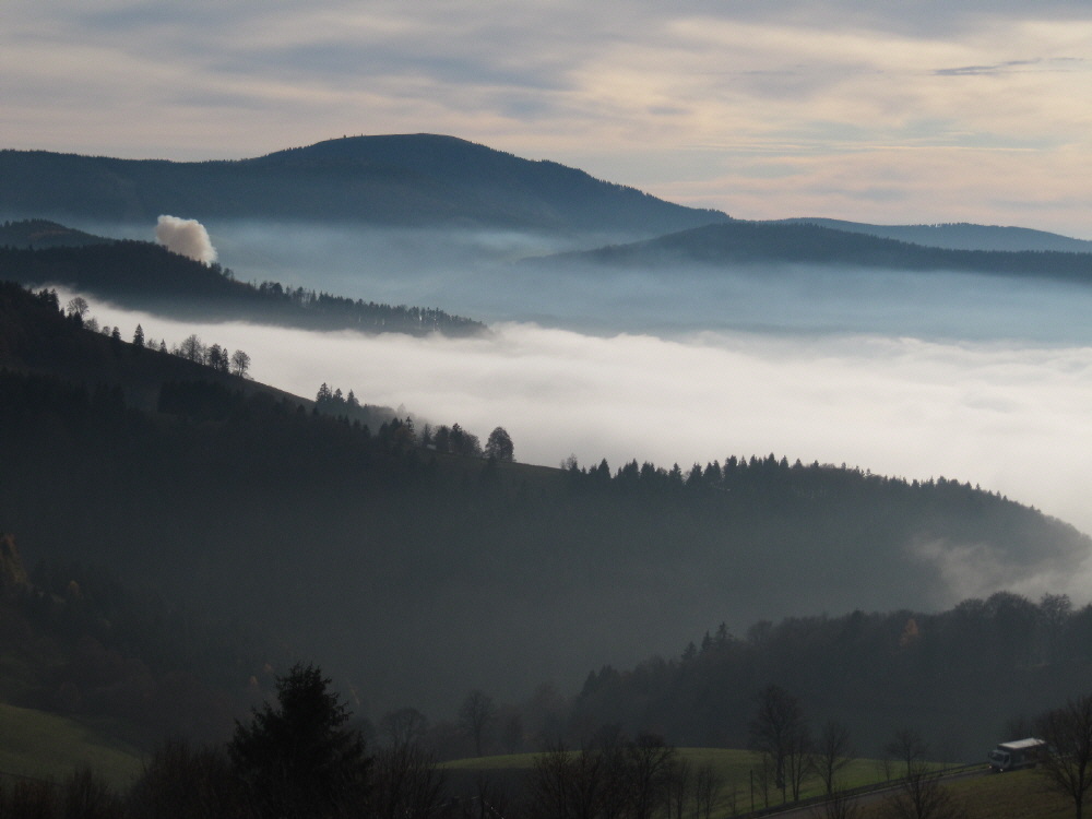 Blick von der Schindelmatt  nach Süden am 6.11.2011: Belchen, Nebel, Feuer