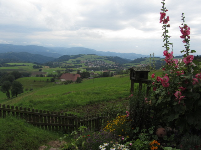 Schmittenbach - das ist ein offener, sonniger nach Süden ausgerichteter Hang zwischen St.Peter-Ort unten im Süden und dem Heitzmannsberg und Vorderen Willmen oben im Norden. Vom Schmittenbach haben Sie einen herrlichen Blick über St.Peter nach St.Märgen im Osten, zu Schweighöfen und Thurner im Südosten, zum Feldberg im Süden, Schauinsland im Südwesten und übers Rheintal zu den Vogesen im Westen.