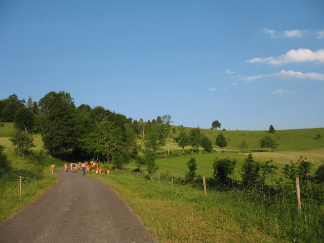 Kühe um 7 Uhr vom Burkart-Hof hoch auf die Weid auf der unteren Stuhlebene treiben am 13.6.2006