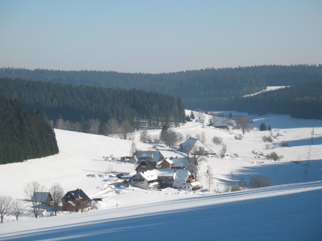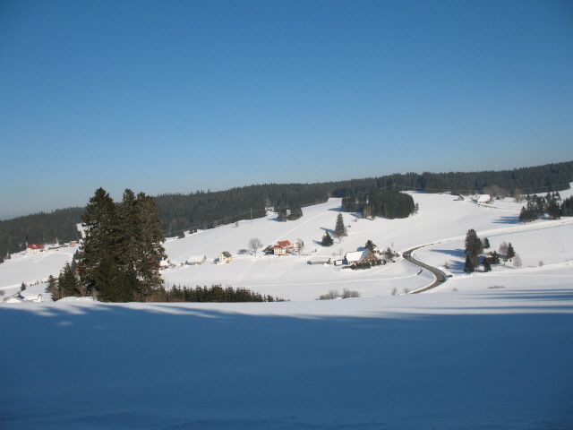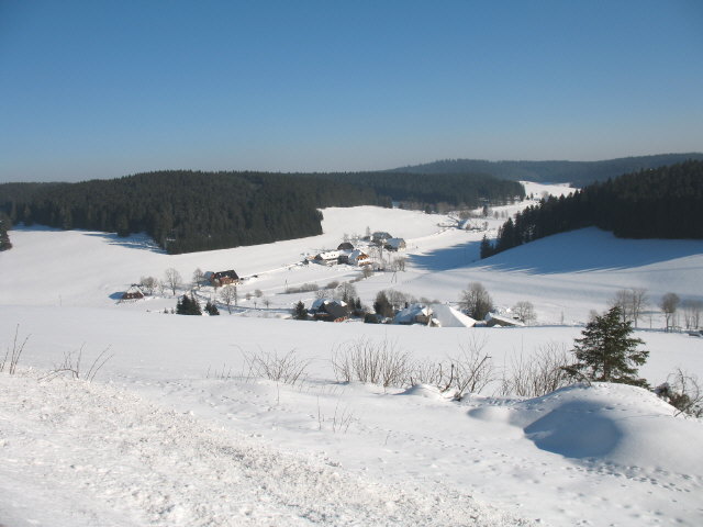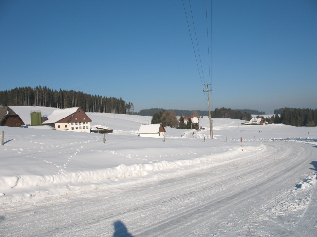 Blick nach Südwesten zu Maierhof, Rössle und Othmarshof (von links) in Schönwald-Weißenbach am 8.2.2005 abends Blick von Schwarzenbach kommend nach Südwesten auf Weißenbach am 23.1.2006 - Othmarshof Mitte oben