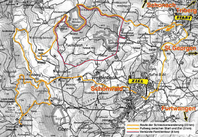 Schneckenwanderung (23 km): Inselklause zwischen Schönwald und Schonach/Triberg, Bartlisbauernhof, Blindenkopf (1022 m), NSG Blindensee, Farnbauernhof mit Wendelinkapelle, Farnberg, Rundweg zur Martinskapelle, Weißenbacher Höhe, Weißenbachblick, Schönwald.