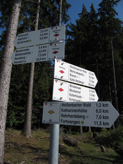 Blick nach Osten zum Wegweiser "Blindensee 990 m"