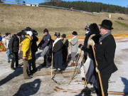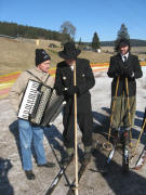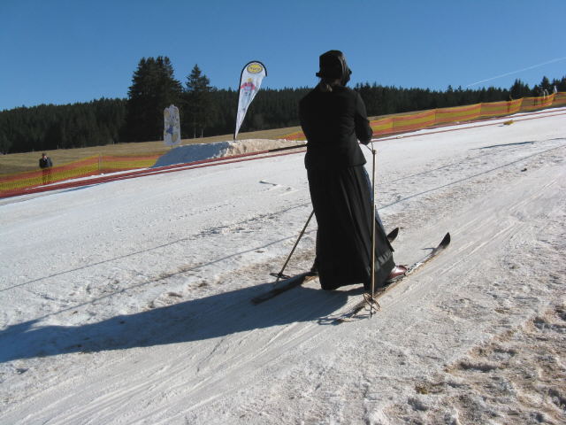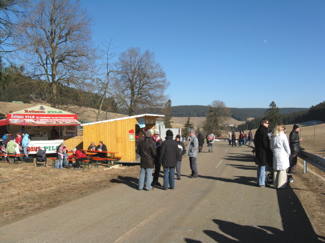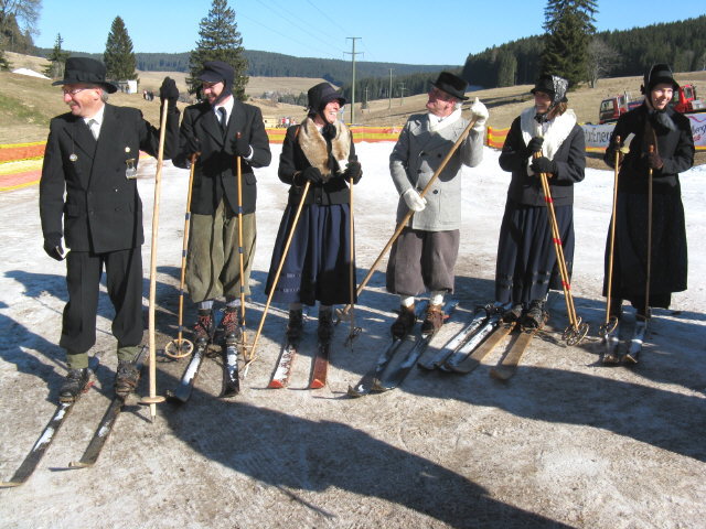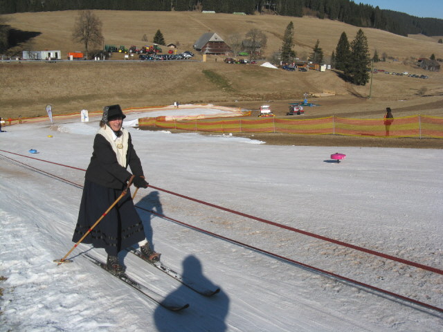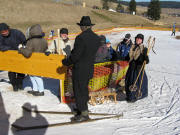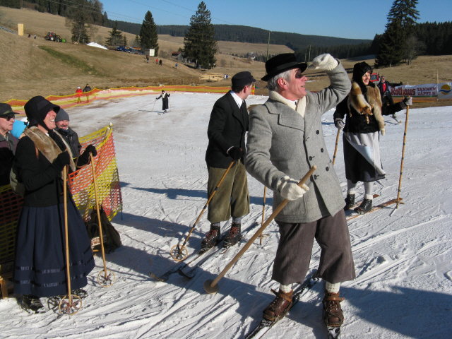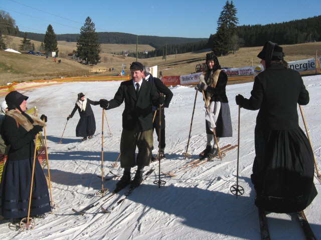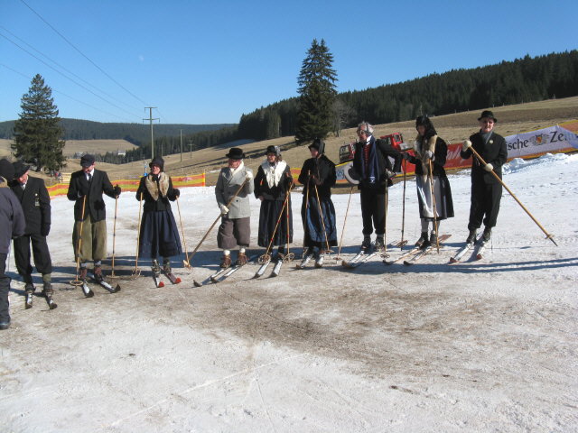 Weiträumig sperrte die Feuerwehr die Durchgangsstraße ab, den Besuchern wurde ein Transport vom Bürgersaal zum Skihang angeboten, dies auf unterschiedlichste Art und Weise, sei es mit dem Bus, mit der Pferdekutsche, dem "Wald- und Wiesenwägele" oder mit dem Titiseer Bähnle. Vor Ort am Skihang herrschte Hochbetrieb, Verpflegungsstände sorgten dafür, dass weder Hunger noch Durst bei den Besuchern aufkamen, Präsentationen von Autos, Schneefräsen und Pistenbullys ergänzten die Veranstaltung. Auf dem breiten Schneeband, welches die Organisatoren in mühevoller Vorbereitung angelegt hatten, herrschte Hochbetrieb beim Schaulaufen. Da waren zum einen die historischen Skiläufer von Feldberg-Bärental. Die Damen im feinen Kostüm, zum Teil mit Fuchspelz als Kälteschutz für den Hals und klassischen Ohrenwärmern, die Herren im feinen Zwirn oder Kniebundhose. Die Sportgeräte von damals, einfache Holzskier ohne Stahlkanten, zum Teil noch mit Riemenbindungen, mit einem Skistock, der nicht nur zur Richtungsänderung bei der Talfahrt eingesetzt wurde, sondern auch als Bremse. Sie faszinierten nicht nur durch ihren optischen Eindruck, auch die Fahrten auf der eisigen Piste belebten die Veranstaltung. Begeistert hiervon zeigte sich auch das SWR-Fernsehteam, das das Treiben rund um den Schneckenhof beobachtete. Ausgestrahlt wird die Sendung am kommenden Sonntag, 24. Februar, um 18.30 Uhr in der Sendereihe "Treffpunkt" . Ein Kontrastprogramm zu den Skifahrern von einst war das Schaufahren mit moderner Wintersporttechnik. Die Skischule Gundolf Thoma präsentierte mit einer Vielzahl junger Skiläufer nicht nur Material, sondern auch Skifahren auf heutigem Niveau. Mit von der Partie war auch Christine Dietsche, Vorzeigesportlerin aus Eisenbach, die als Europameisterin und Vizeweltmeisterin eindrucksvoll die Beherrschung des Snowboardens demonstrierte. Begeistert verfolgten die Zuschauer von der Straße aus und am Hang die Vorführungen. Zufriedene Gesichter gab es bei den Veranstaltern. Bürgermeister Alexander Kuckes und Ortsvorsteher Peter Kleiser zeigten sich zufrieden, die großen Bemühungen um ein gelungenes Fest hätten sich gelohnt. Ein Lob galt den vielen Helfer und vor allem der Schollacher Dorfgemeinschaft. Der Samstag am Skihang wurde abgerundet mit einer Fackelwanderung mit anschließender Après-Ski-Party sowie mit einem Feuerwerk